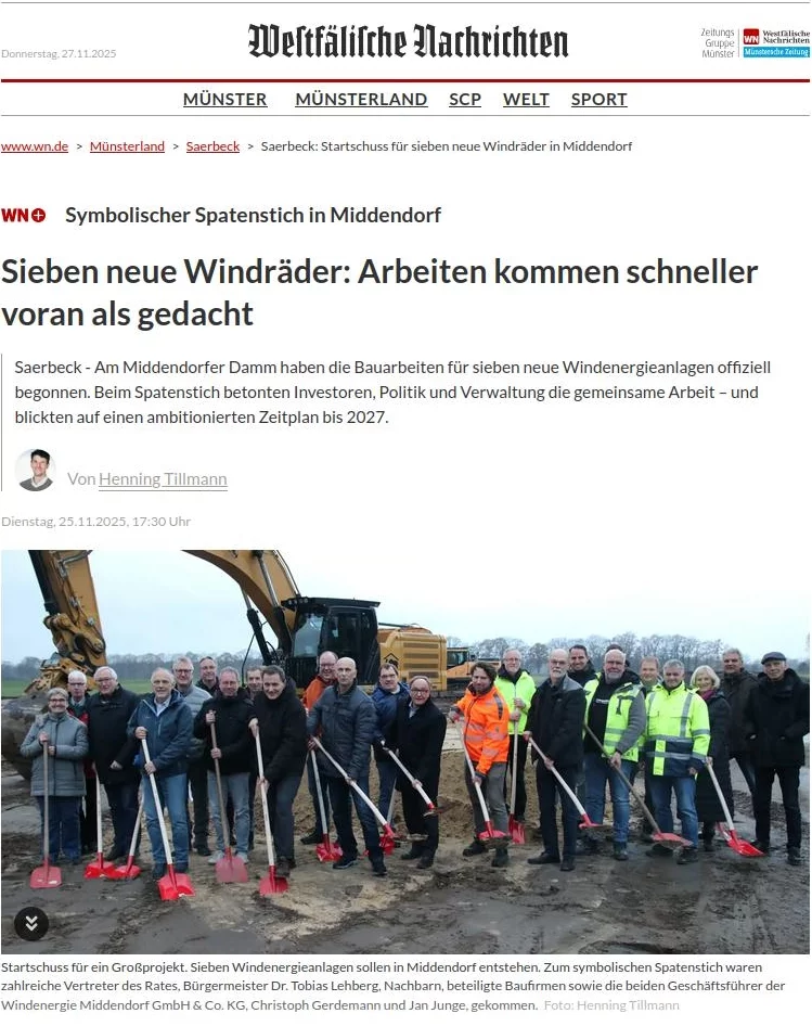 „Beide Windparks nutzen Synergieeffekte“, erklärte Baar. Die elf Windkraftanlagen seien bei einem renommierten Hersteller reserviert und sollen, so die Planungen, Ende 2026 aufgebaut werden. Angebunden ans Stromnetz werden die Middendorfer Anlagen über eine Umspannstation im Gewerbegebiert Reckenfeld, die gerade gebaut wird, die Sinninger werden voraussichtlich über Emsdetten angeschlossen.